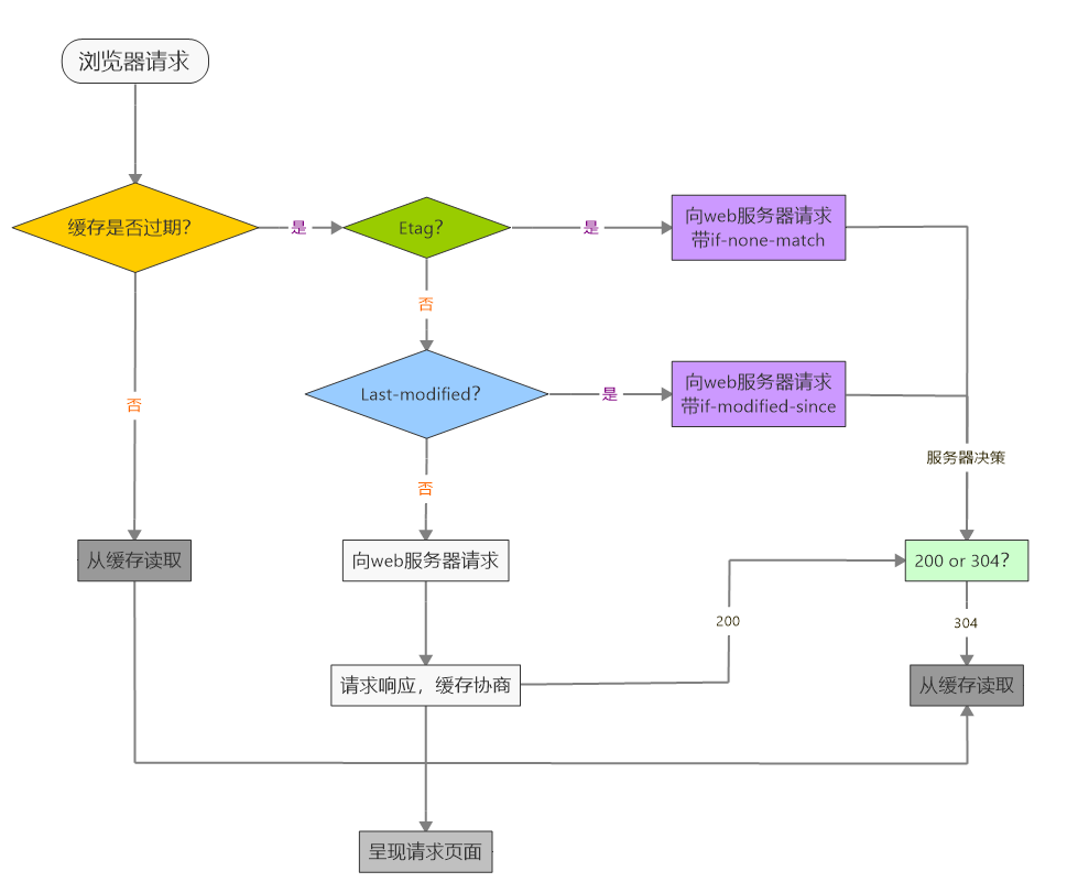 如果过期,服务器算出一个哈希值并通过 ETag 返回给浏览器,浏览器把哈希值和页面同时缓存在本地,当下次再次向服务器请求时,会通过类似 If-None-Match: “etag值” 的请求头把ETag发送给服务器,服务器再次计算页面的哈希值并和浏览器返回的值做比较,如果发现发生了变化就把页面返回给浏览器(200),如果发现没有变化就给浏览器返回一个304未修改。这样通过控制浏览器端的缓存,可以节省服务器的带宽,因为服务器不需要每次都把全量数据返回给客户端。