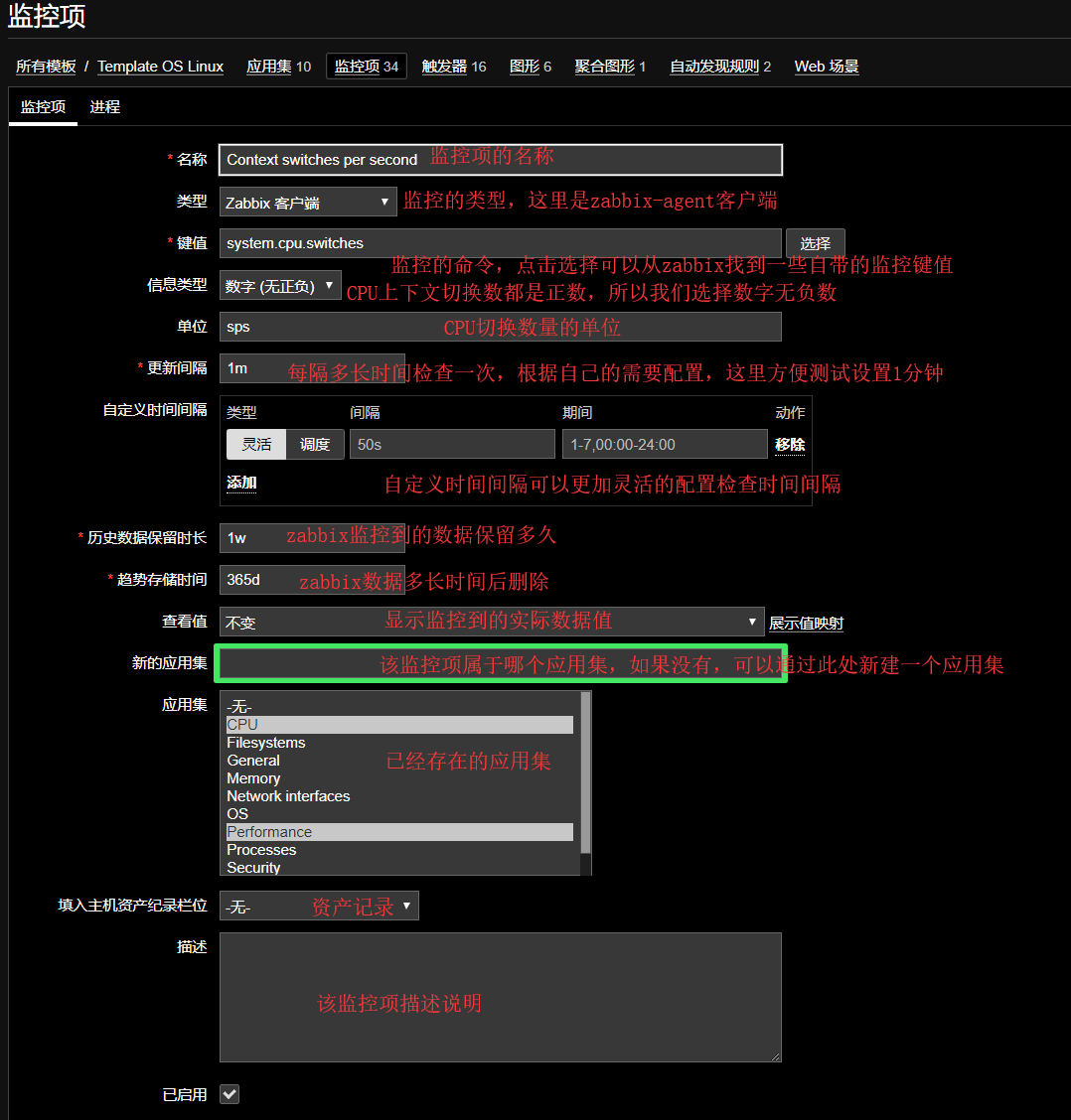 现在我们想要在Template OS Linux模版中创建CPU的上下文切换的监控项,那么我们可以在此界面进行如下配置。