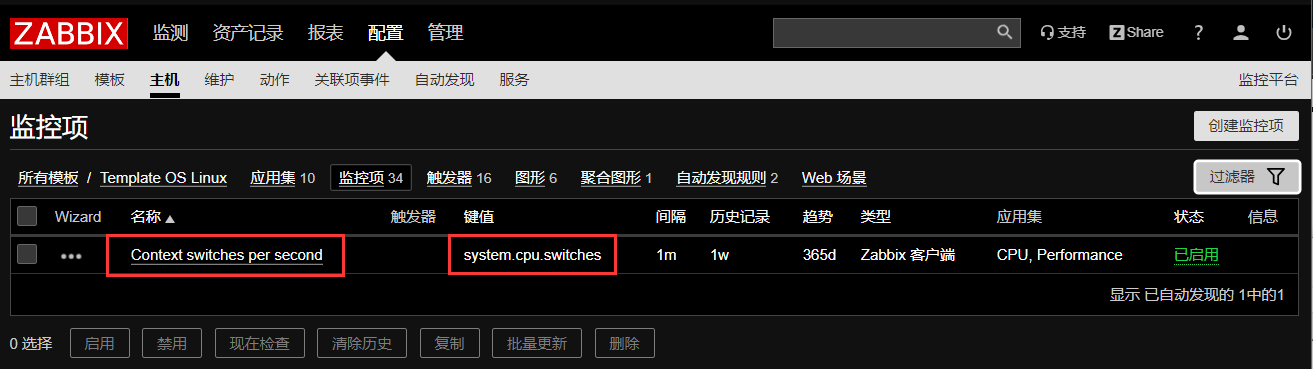 现在我们可以看到在Template OS Linux模版中已经有我们刚刚创建的名为Context switches per second监控项