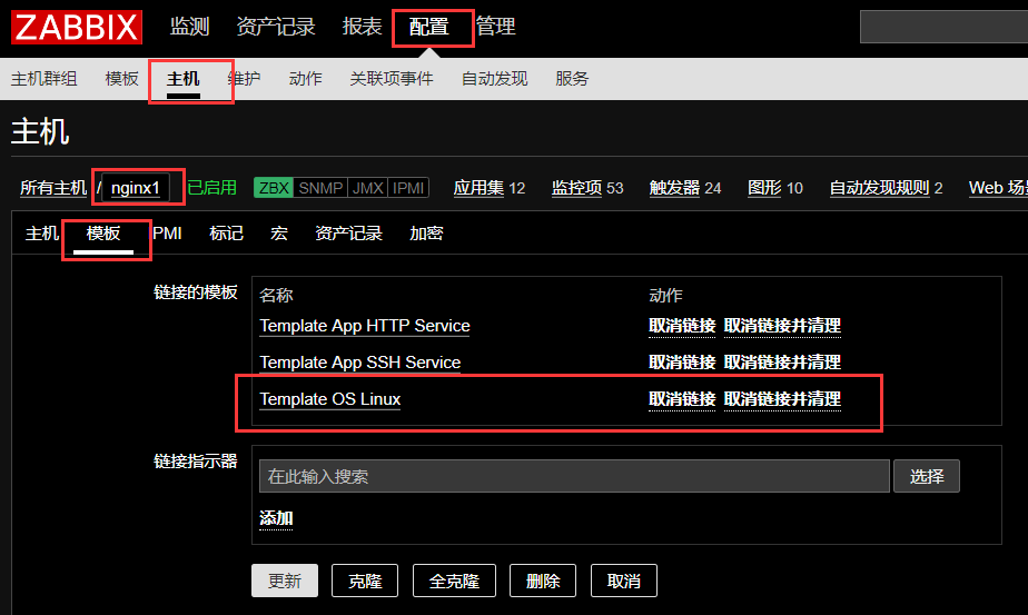 由于Template OS Linux模版在上面已经加入到nginx1主机了,所以我们这里就不做主机和模版关联了