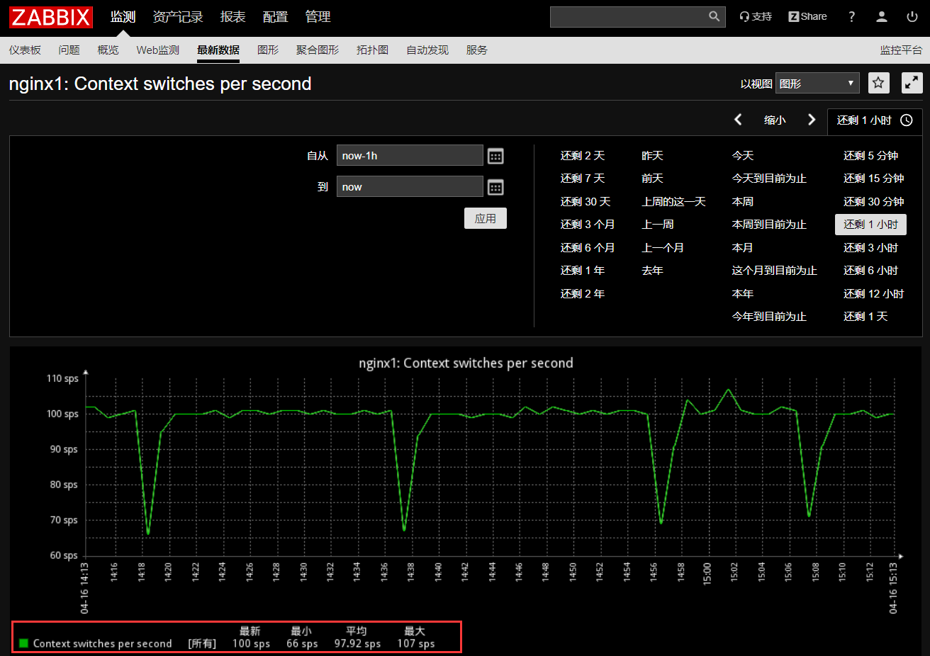 完成以上操作后,我们对主机进行cpu上下文监控也就配置完成,可以等待2分钟让zabbix进行数据采集后,在监测-最新数据通过过滤器过滤出CPU上下文切换的监控项最新数据