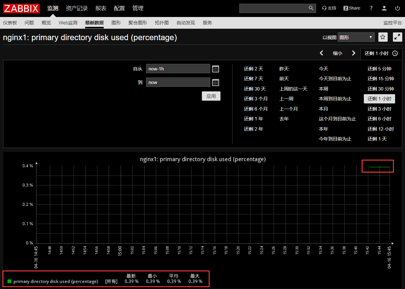 最后等待几分钟在监测-最新数据通过过滤器过滤出磁盘使用率的监控项最新数据