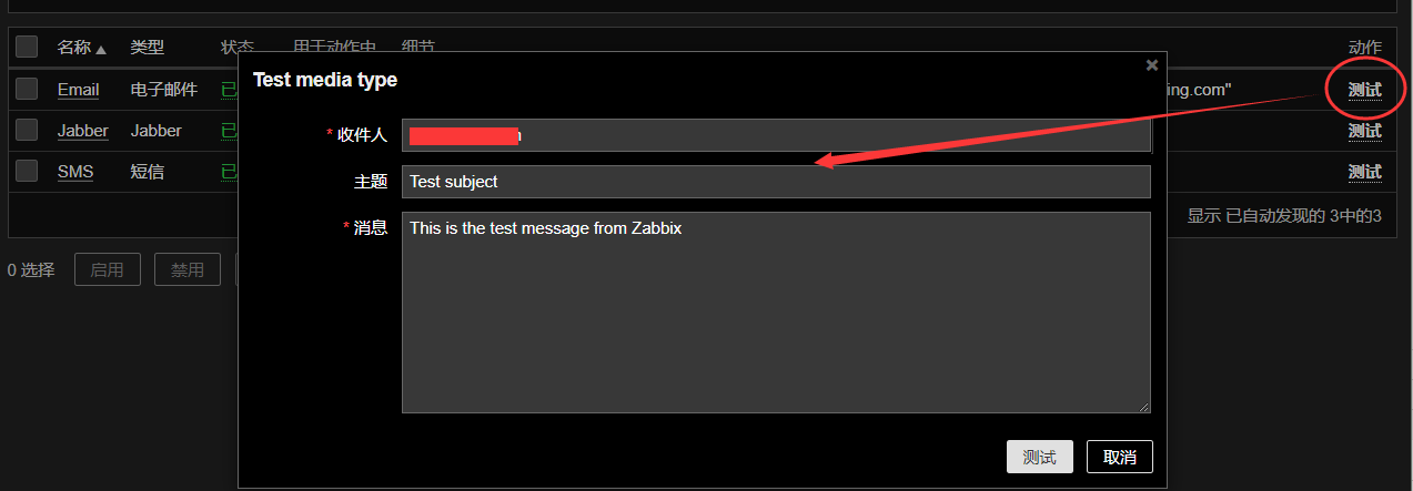 之后,我们可以在报警媒介类型中看到已经添加的报警类型,点击右边的测试,可以测试当前邮件配置是否正常,如果配置正常你将收到测试的邮件。