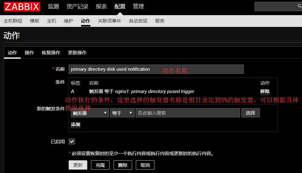 在zabbix中创建一个动作,前文中我们已经创建了用于监控磁盘根目录使用率的监控项,以及对应的触发器,现在,我们需要创建一个动作,与监控项和触发器结合起来一起使用。