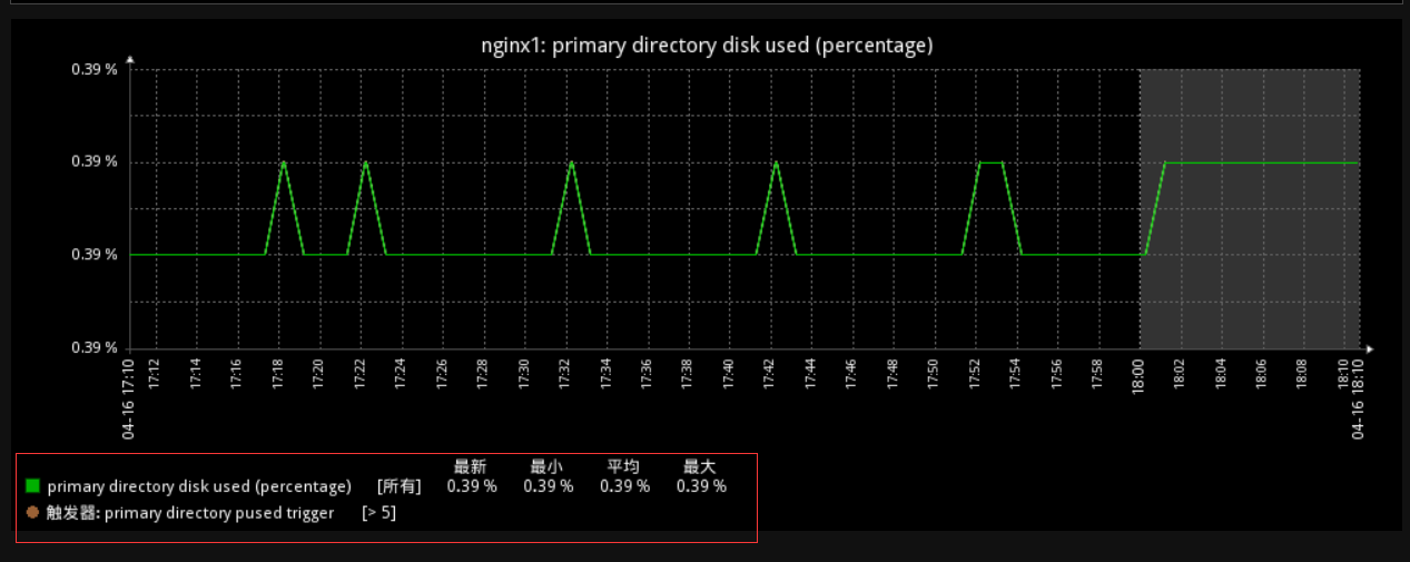 在模拟前,我们先看看之前磁盘根目录使用率是多少,使用率0.39% 阀值5%。好了,现在我们进入到被监控主机的根分区,在根分区中创建一个大文件,提高磁盘使用率。1