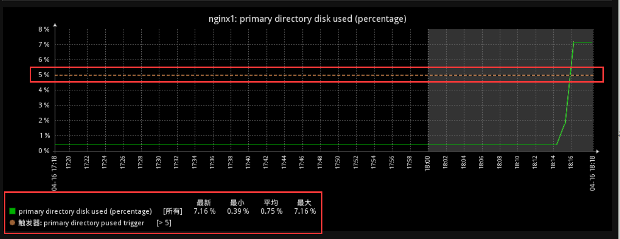此时我们的根分区使用率已经达到了8%,超过了触发器设置的阀值5%,我们看看下图,(这里显示的是7.16%和df -h命令8%差一点点是由于linux只显示整数,小数点增1位)