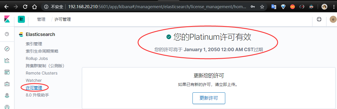 由结果可以看出x-pack到期时间为2049-12-31,破解完成。也可以在kibana web页面管理中查看破解详情。